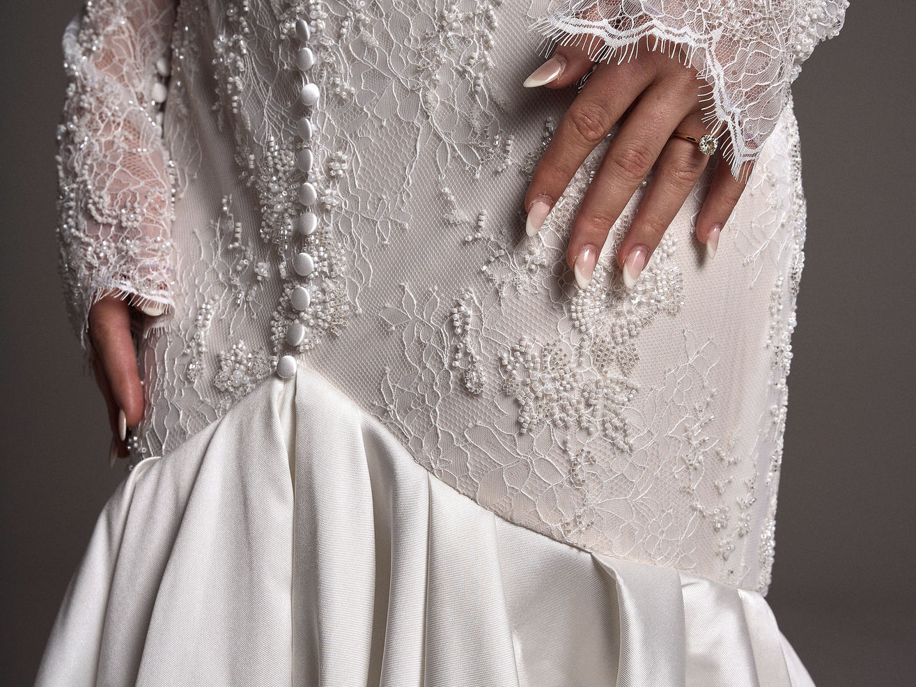 A true couture gown; embellished lace with buttons all the way down leading into a mermaid train.